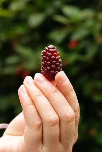 The thornless Logan is thought to be a wild cross between a blackberry and a red raspberry. Plants are only about half as productive as either Marionberry or Tayberry, but large, flavorful fruit has a unique quality that is highly prized. Many people prefer the flavor to all others. USDA Zones 6-10.